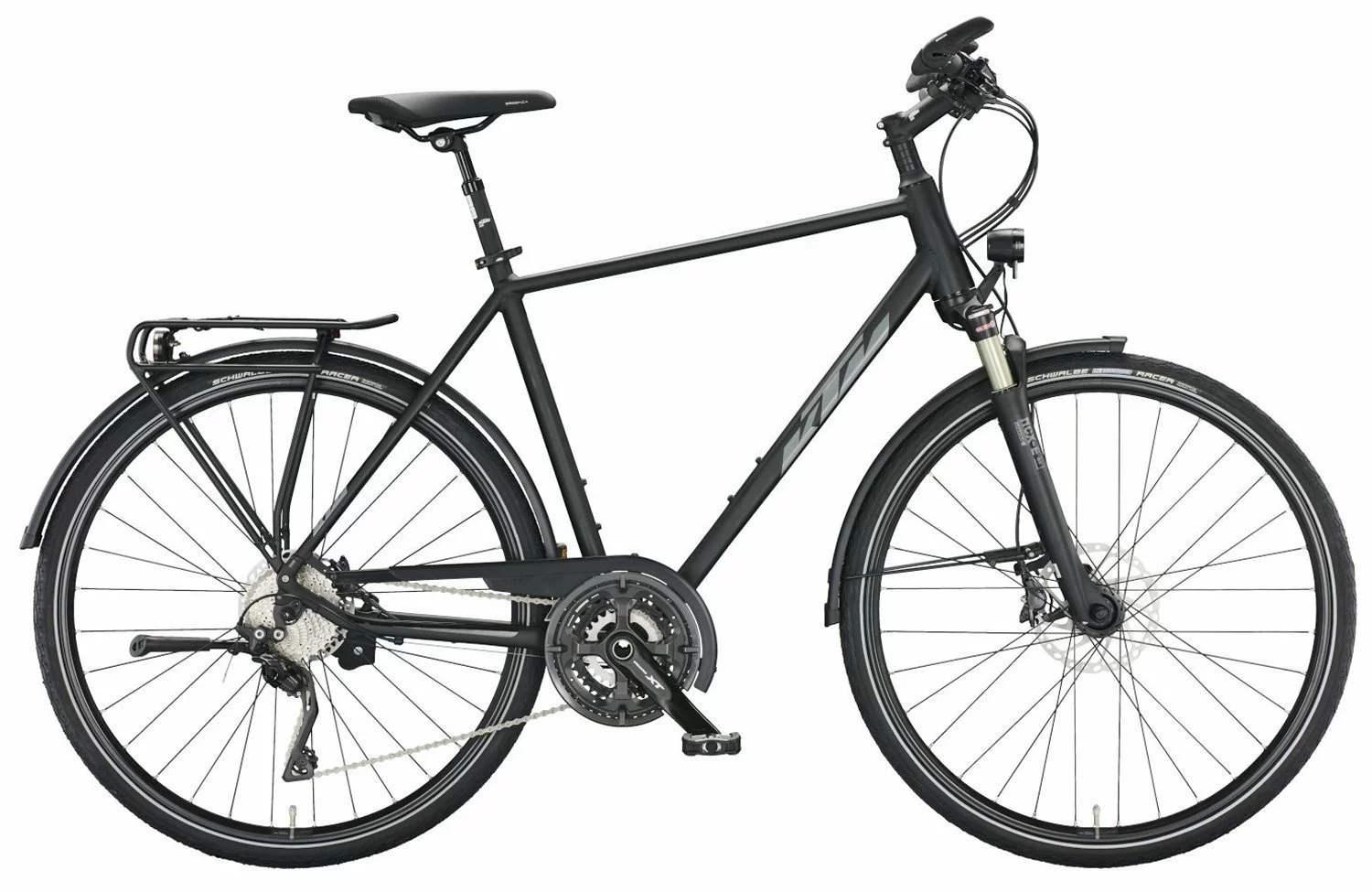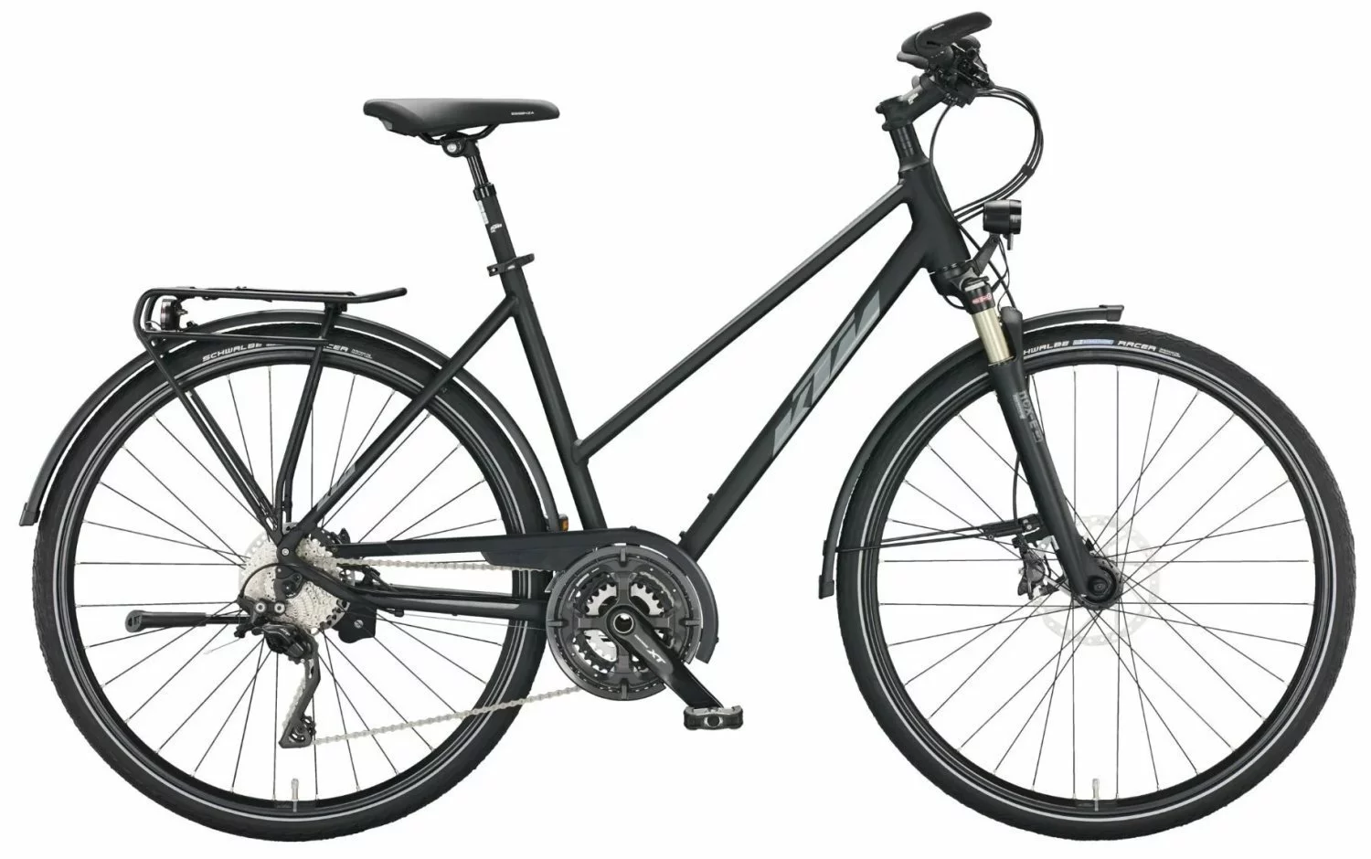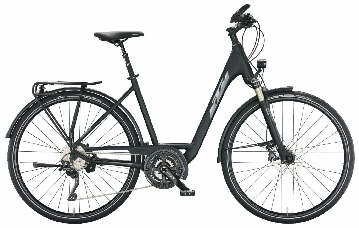 Alu 6061 triplebutted Rahmen für tapered Gabel, integrierte Lichtkabelverlegung und Steuersatz mit Lenkwinkelbegrenzer, Suntour NCX-E-LO Federgabel mit 63mm Federweg, 30-Gang XT Schaltwerk, Umwerfer, Schalthebel, Naben, Kurbeln und Disc-Bremsen, Deore Zahnkranz, Rival 23 Disc Felgen, Marathon Racer Reifen 40-622, 70 Lux LED-Lampe, Stand- und Tagfahrlicht, gefederte Satori Sattelstütze, Hebie Fix40 Ständer