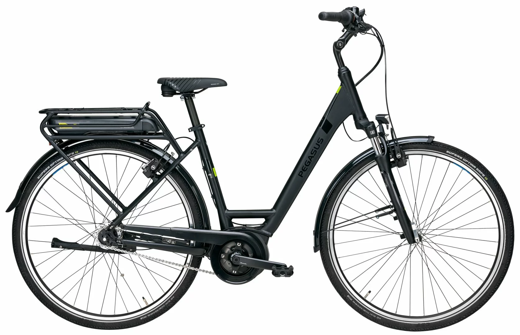 Alu-Rahmen mit integriertem Gepäckträger und Akku-Aufnahme, NEX-E25-HLO Federgabel, Nexus 7-Gang Nabenschaltung mit Freilauf, Magura HS-11 Bremsen, ZAC19 Hohlkammerfelgen, verstellbarer Lenkervorbau, Bosch Active-Line Mittelmotor 250W/40Nm, 400Wh oder 500Wh Akku, Supero Optima Safe Reifen (44-622), 30 Lux LED-Lampe