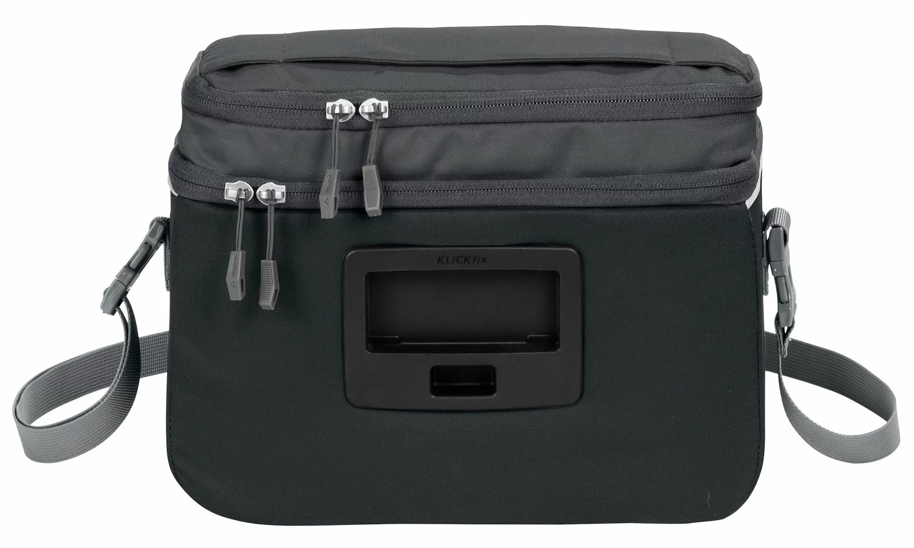 Auf Radwegen zu Hause. Die große Lenkertasche im klassischen Look wird aus einer Kombination aus leichten und robusten Materialien hergestellt, die nach dem strengen Umweltstandard bluesign®zertifiziert sind. Das Deckel- und Hauptfach sind mit Organizerfächern ausgestattet; darin verstaust Du Wertgegenstände übersichtlich und kannst jederzeit schnell darauf zugreifen. Die Tasche wird per KlickFix-Adapter stabil am Lenker befestigt und lässt sich schnell und einfach abnehmen. Durch den mitgelieferten Tragegurt kannst Du sie bequem über der Schulter tragen. Reflexstreifen sorgen rundum für eine gute Sichtbarkeit im Straßenverkehr. Inklusive Regenhülle.